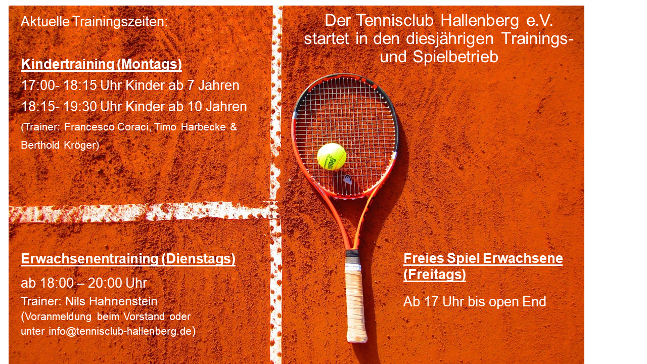 Liebe Mitglieder und Tennis-Interessierte, es kann wieder losgehen!Wir freuen uns Euch mitteilen zu können, dass die Plätze von Euch wieder bespielt werden können.  Dieses Jahr bieten wir folgende Trainingszeiten an: Kindertraining (immer Montags) - 1...
